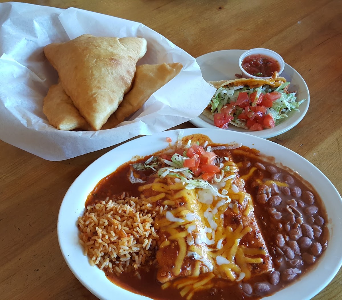 We really enjoyed our lunch. The staff was friendly and attentive. The food was delicious. The sopapillas were the best ever. The burger looks small next to the heaping salad (which was a great salad) but it was thick and cooked to perfection. Very filling. I couldn't eat it all. Kids had a Xmas burrito and cheese quesadilla. We can't wait to return. We already know what we want to try next.